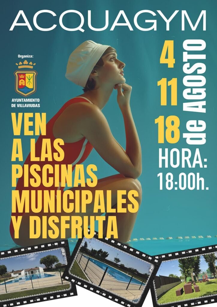 💦 ¡Este verano, mójate con ritmo en Villaviudas! 🏊♀️ ACQUAGYM en las piscinas municipales 📆 4, 11 y 18 de