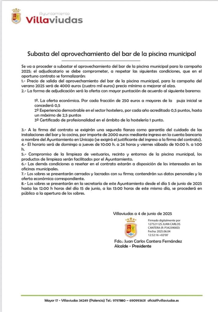 Subasta del aprovechamiento del bar de la piscina municipal Se va a proceder a subastar el aprovechamiento del bar de
